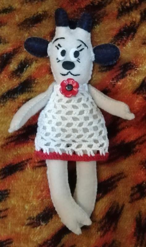 Кізка іграшка з фетру, наповнювач холлофайбер. Сукня пов'язане гачком. Довжина 15см