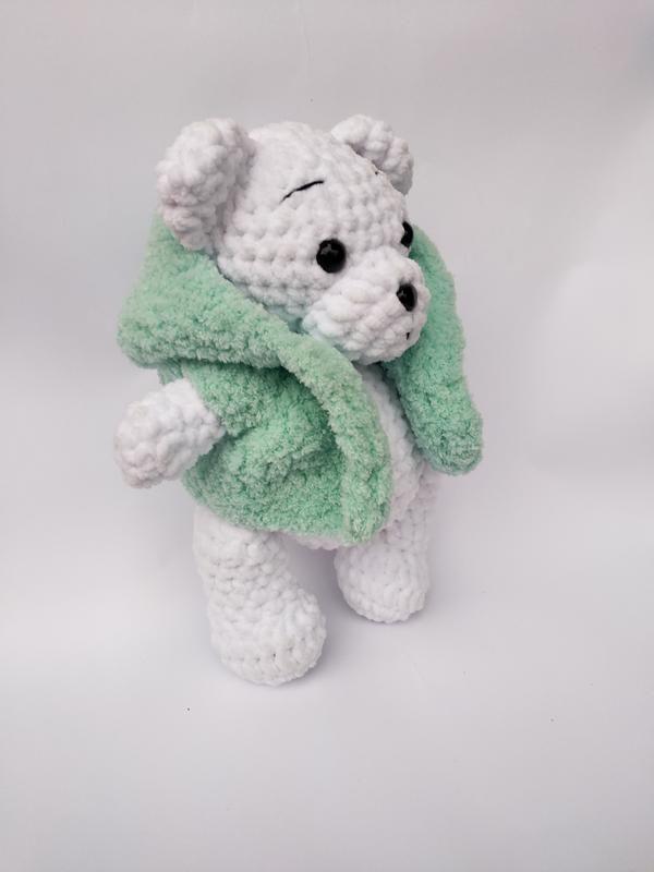 Ведмедик білий в жилетці м'ятного кольору. Мишко пов'язаний з плюшевою пряжі, оченята на безпечному кріпленні, наповнювач холлофайбер.Жилетка знімається, зростання іграшки 25 див. Оригінальний подарунок Додаткові характеристики: Вид: Мишко