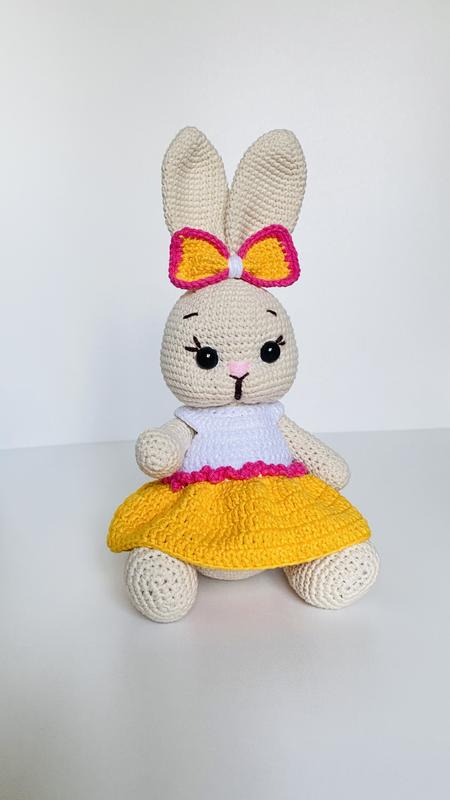 Вязаное маленькое зайчонок ручной работы. Детки обожают брать их с собой. Его можно легко надевать и разряжать. Дополнительно можно приобрести любое платье. Высота - 28 см (с ушками) Пряжа - 50% акрил, 50% бавовна. Наповнювач - холлофайбер. Срок исполнения 2-3 дня.