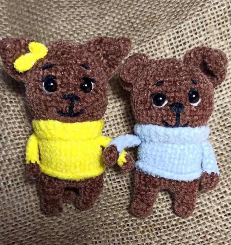 В'язані іграшки-брелоки з мікровелюру. Очі на безпечному кріпленні. Всередині іграшок встановлені неодимові магніти, за рахунок яких іграшки цьомкаються. Продаються парою 400 грн./шт. Парні брелоки стануть чудовим подарунком для закоханих.