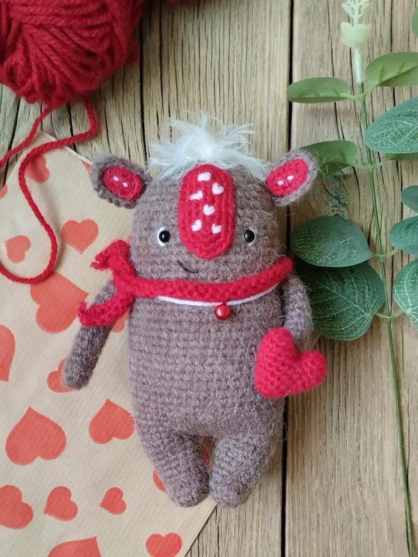 Веселий диводух кохання. Маленький компаньйон, що дарує любов та радість. Іграшка розвиває дрібну моторику, за рахунок тактильного контакту і в'язаного полотна. Повністю безпечна. Зв'язана з пряжі альпака + акрил, наповнювач - холлофайбер. Оче на безпечному кріпленні, додатково запаяні з середини.Розмір - 15 см
