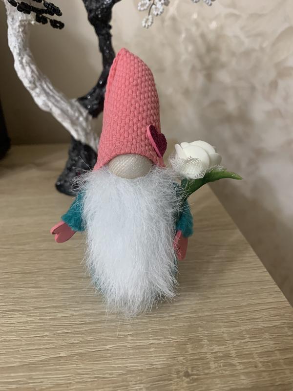 Святковий гномик ручної роботи. Має рожевий ковпак, довгу пухку бороду та смарагдовий костюмчик. Гномик тримає в руці білу троянду що символізує довіру і гармонію. Цей маленький гномик гарно прикрасить вашу оселю!❤️