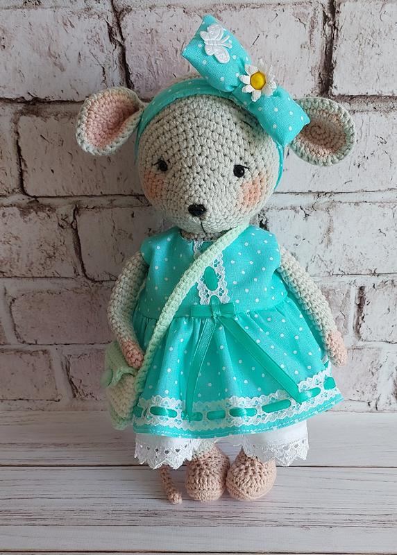 Маленький, вязаный мышонок любит конфеты и хорошо одеваться. Яркое платье украшено тонким кружевом и атласной лентой. Модница имеет сумочку, в которой всегда есть конфета. Одежда и аксессуары снимаются. Розиор игрушки 25 см.