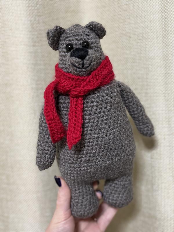 Ведмедик сірий з шарфом. чудовий подарунок ручної роботи.