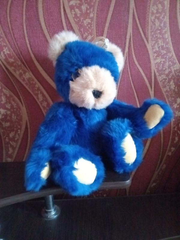 мишка шарнирный.очень красиво выполнена.инткрьерная.на головке сантиметровая лента.можно подарить тому. кто любит шить.мех приятный на ощупь.очки стекло.голубы.