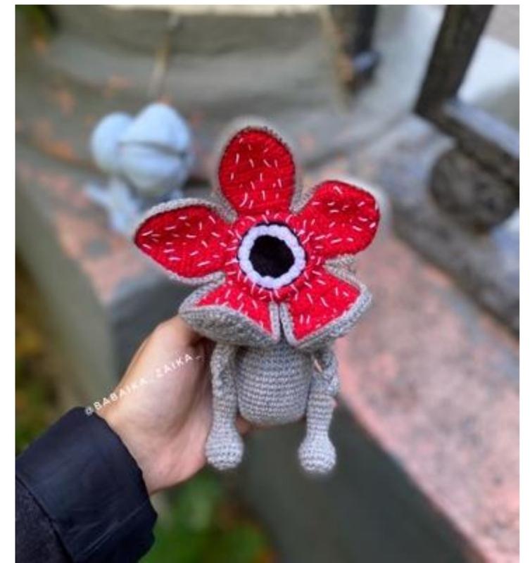 вязаный демонгоргон Под заказ 3,5 дней. особенности: ~высота 15см. ~выполнена в технике аммигурума. ~серое тело с красной цветочной головой. ~центральный черный глаз. ~четыре лапы. ~качественная пряжа и аккуратная вязка. идеально подходит для фанатов сериала.