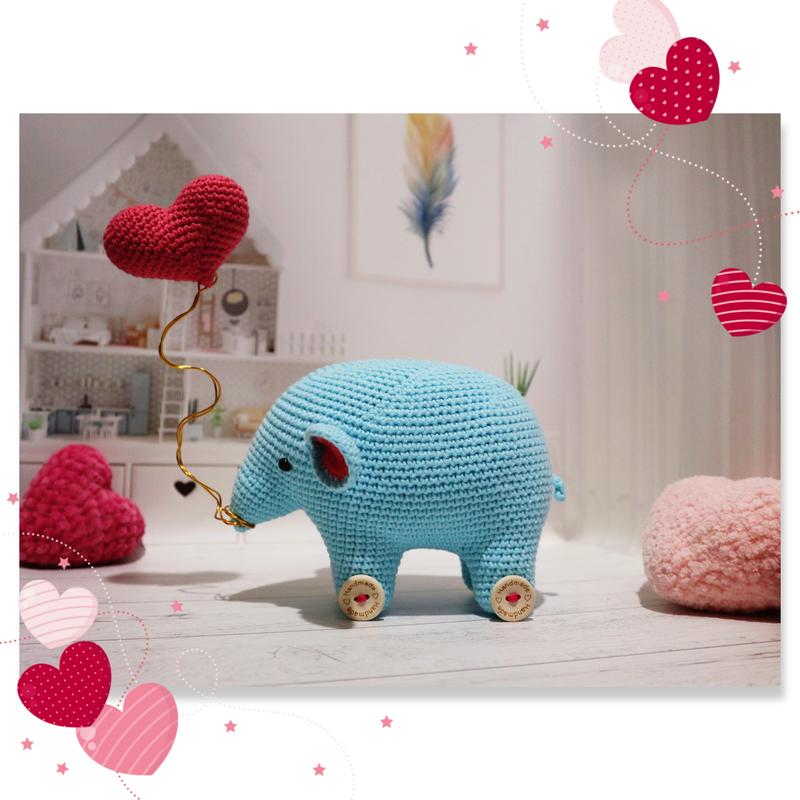 Слоник зв'язаний із напівбавовни, наповнювач — холофайбер. У довжину — 15 см, заввишки разом із серцем — 20 см. Серце знімається.