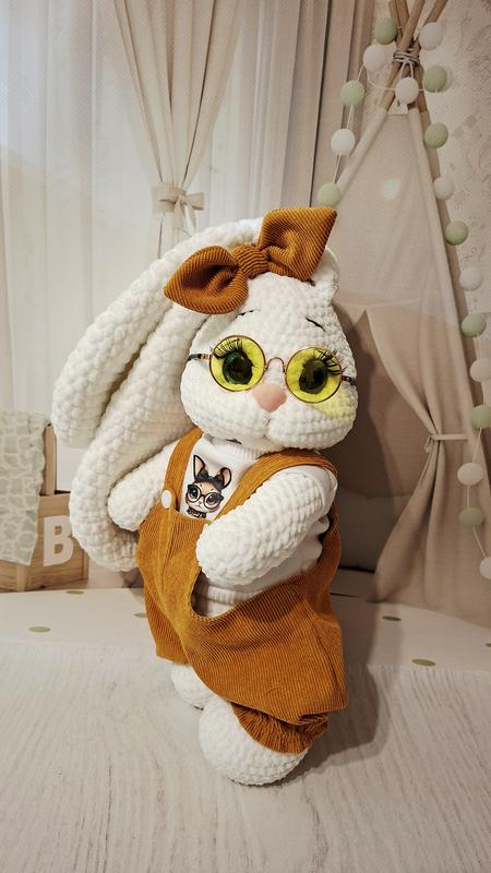 Зайчик в'язаний голова та лапки рухливі, одяг знімається.