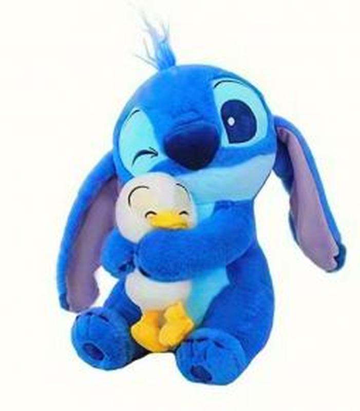 М'яка іграшка Стіч, персонаж із мультфільму Disney "Ліло і Стіч". Зовнішній вигляд: Іграшка являє собою синього плюшевого Стіча з великими вухами, великим носом та одним примруженим оком. Особливість: Стіч обіймає маленьку текстильну качечку білого та жовтого кольорів. Матеріал: Виріб виготовлений з м'якого плюшу з наповнювачем, приємний на дотик. Призначення: Підходить як для гри, так і для колекціонування або декору. Розмір : 35 см
