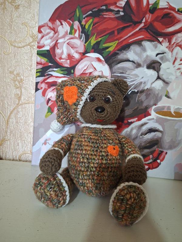 В’язаний ведмедик ручної роботи Зв’язаний гачком із якісної пряжі, наповнений гіпоалергенним наповнювачем. Очі на безпечному кріпленні. Підійде для подарунка дитині або як декор у кімнату. Розмір: 29 см. Ціна: 350 грн.