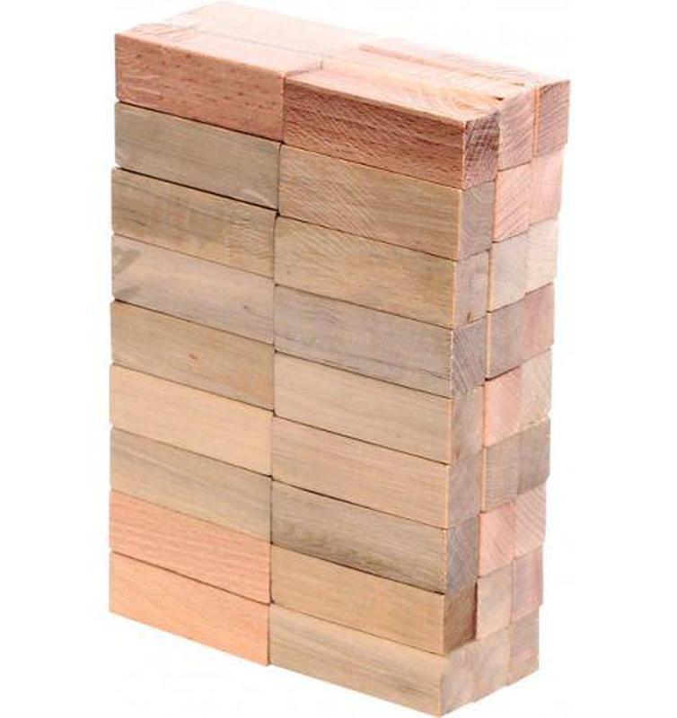 Игра "Дженга", 54 детали. 1. Соберите башню высотой в 18 этажей. Каждый этаж состоит из трёх блоков, положенных вплотную и параллельно друг другу. Блоки каждого следующего этажа кладутся перпендикулярно блокам предыдущего этажа. 2. Начинает игру тот, кто построил башню. Каждый игрок во время своего хода вынимает только один из брусочков, расположенных в любом месте ниже верхнего целого этажа башни, и укладывает его на башню под прямым углом к брусочкам, находящимся непосредственно под ним. Пользоваться при этом можно только одной рукой. 3. Продовжуйте гру за годинниковою стрілкою, за кожен свій хід перекладаючи тільки один брусочок. Перемагає гравець, який останнім пересунув свій брусочок і при цьому не зруйнував вежу. Гравець, який зруйнував вежу, готує її для наступного раунду.