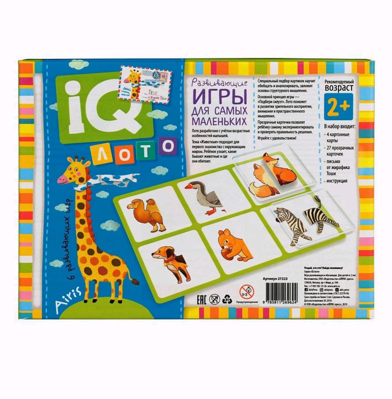 Стать: Унісекс Вік: 2 роки Тип іграшки: Пазли Лото розроблено з урахуванням вікових особливостей малюків. Тема "Тварини" підходить для першого знайомства з навколишнім світом. Дитина дізнається, які бувають тварини і де вони мешкають. Спеціальний підбір картинок навчить узагальнювати й аналізувати, закладе основи структурного мислення. Основний принцип гри - "Знайди половинку". Лото допоможе в розвитку зорового сприйняття, уваги та просторового мислення. Прозорі картки дозволять дитині самому експериментувати і перевіряти правильність рішення. У наборі 4 картонні картки, 27 прозорих карток і конверт, в якому дитина знайде лист від жирафа Тоші, а дорослі - інструкцію.
