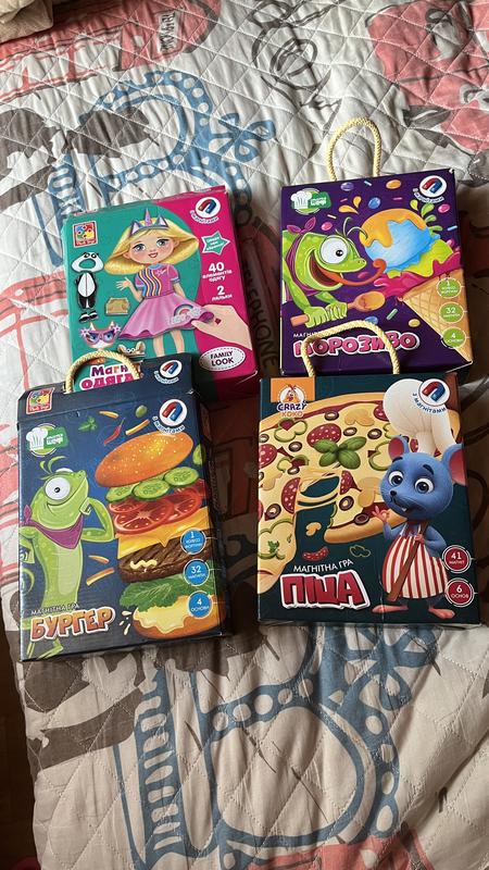Магнітна одягалка не вистачає кота і 3 одяга Морозиво немає вишні Піца не вистачає 2 інгредієнта, одна основа пожована Бургери є все Коробки дві не цілі Продам всі разом