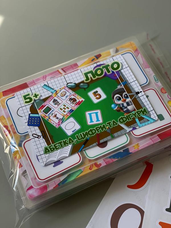 Лото для дітей від 4-5 років на липучках 🅰️ АБЕТКА 🅱️ 1️⃣ ЦИФРИ 2️⃣ ТА 🔴 ФІГУРИ 🟩 ☑️10 ігрових полів ☑️60 деталей-карток ☑️Інструкція з варіантами ігор Формат А5 Дивіться також інші мої оголошення 🤗