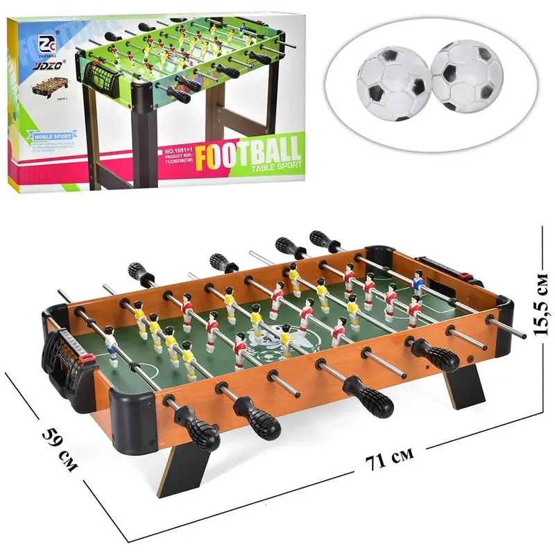 ⚽ Настільний футбол 1081А — активна гра для дітей і дорослих Цей дерев’яний настільний футбол дозволяє відчути атмосферу справжнього матчу просто вдома. Оснащений штангами з фігурками гравців, механічним табло для рахунку та двома м’ячами в комплекті. Ігрове поле розміром 65×36 см, загальні габарити столу — 71×59×15,5 см. Підходить для дітей від 5 років, розвиває моторику, реакцію, логіку та командну взаємодію. Матеріал — дерево. Ідеальний для сімейного дозвілля, подарунок для хлопчика або дівчинки.