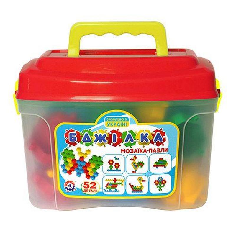 Мозаїка пазл "Пчелка" складається з 52 яскравих пластикових шестикутників, з'єднуючи які можна складати різні фігурки та візерунки. Розмір однієї детальки: 60 мм. Як паковання — пластикова валізка зі зручною ручкою.