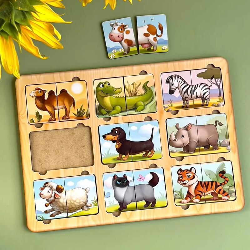 У наборі 6 картинок тварин, які розділені навпіл. Необхідно знайти свою половинку або ж пофантазувати і створити не "зебру", а, наприклад, "кото-зебру". Порахуйте тварин та розкажіть дитині, де вони живуть, що їдять і які звуки властиві саме їм. Деталі легко діставати пальчиками. 1. Розвиток логічного і понятійного мислення 2. За допомогою такого методичного матеріалу, діти пізнають навколишній світ. 3. Розвивається дрібна моторика. Вставляючи певним чином детальки, чудово тренуються пальчики. 4. Працює зорова пам'ять, тренується увагу і посидючість.