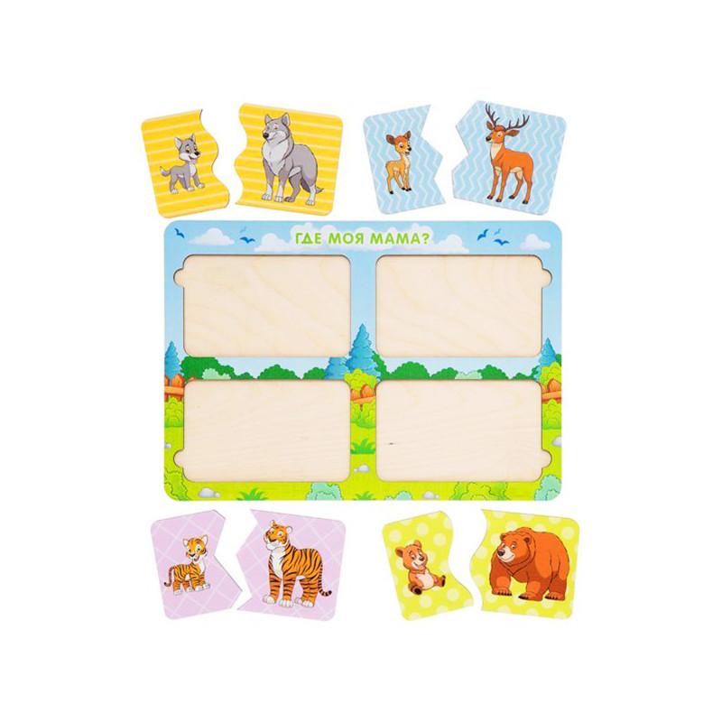 У наборі 4 мініпазли диких тварин, що належать до 4 сімейств. Кожен пазл має індивідуальний розріз і забарвлення, які також слугують для дитини підказкою. Необхідно знайти маму для малюка або навпаки. Деталі легко діставати пальчиками. За допомогою такої гри можна познайомити дитину з тваринами різних видів, вивчати поняття "більше-менше".