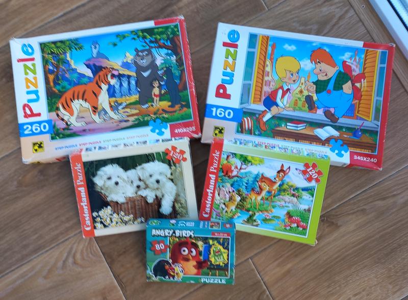 Пазли: Фото 2: 160 элементов, размер 34,5×24,0 см. Фото 3: 260 элементов, размер 41.0×28,5 см. Фото 4: 120 элементов, размер 23×16,5 см. Фото 5: 80 элементов, размер 23×16 см. Фото 6: 120 элементов, размер 23×16,5 см.