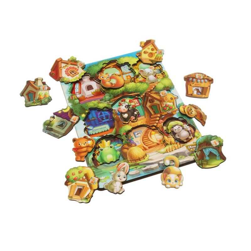 Трехслойный вкладыш в виде дерева, на котором живут 9 животных и у каждого свой тематический домик с номером 1-9. Удобно доставать пальчиками. Все домики с индивидуальным интерьером – это как подсказка для ребенка, чтобы он нашел домики для всех зверей. Например, домик мышки – в виде творога и т.д. 1. Развитие логического и понятийного мышления. 2. С помощью такого методического материала дети познают окружающий мир. 3. Развивается мелкая моторика. Доставая и вставляя определенным образом детали сортера, дети прекрасно тренируют пальчики. 4. Работает зрительная память, тренируется внимание и усидчивость.
