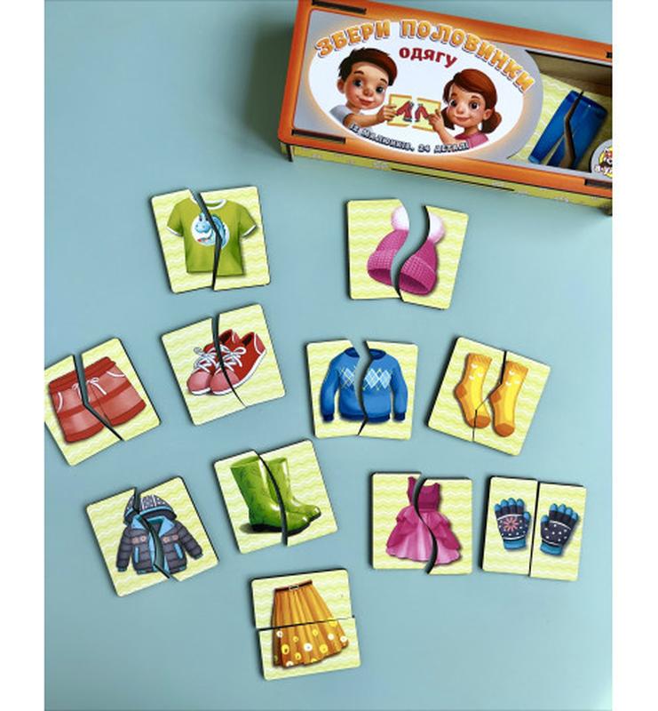 Картинки-половинки - це цікава розвиваюча гра, в якій потрібно скласти картинку з двох частин. Гра сприяє розвитку образного й логічного мислення, вчить сприймати зв'язок між частиною і цілим, розвивають дрібну моторику і посидючість. Завдання дитини - з'єднати половинки так, щоб вийшли цілі картинки із зображенням одягу та взуття