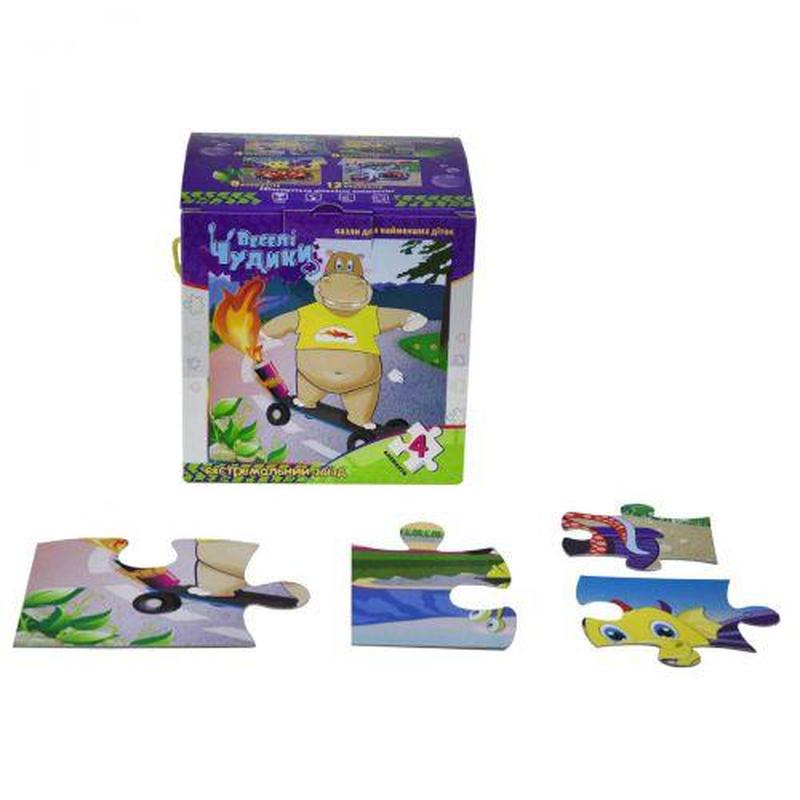 Пазлы 4 в 1 "Веселые чудики". В набор входят 4 пазла для самых маленьких, на 4,6, 9 и 12 деталей. В готовом виде все картинки имеют размер 25 х 25 см, у пазлов отличаются размеры деталей. Развивают логическое мышление, мелкую моторику рук, усидчивость. Бренд: Strateg Упаковка: Коробка Цвет: Разноцвет Тип эл-тов питания: Нет Эл-ты питания в комплекте: Нет Вес в упаковке: 365 г Габариты в упаковке: 17 x 16.5 x 16.5 см Cтрана производитель: Украина Материал: Картон Комплектация: Пазлы (на 4, 6, 9 и 12 элементов)