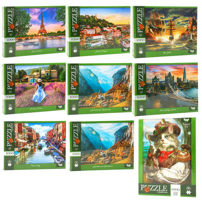 Пазл на 1000 елементів, різні види. Матеріал - картон. Вік - від 8 років. Паковання — коробка. Розмір - 39,3х5х29,3 см.