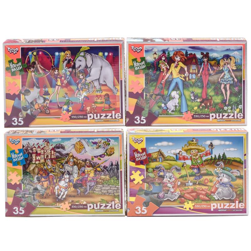 Дитячі пазли, мікс видів. Яскраві кольори. 35 деталей стандартного розміру. Матеріал - картон. Упаковка - коробка. Розмір - 28х3х20 см.