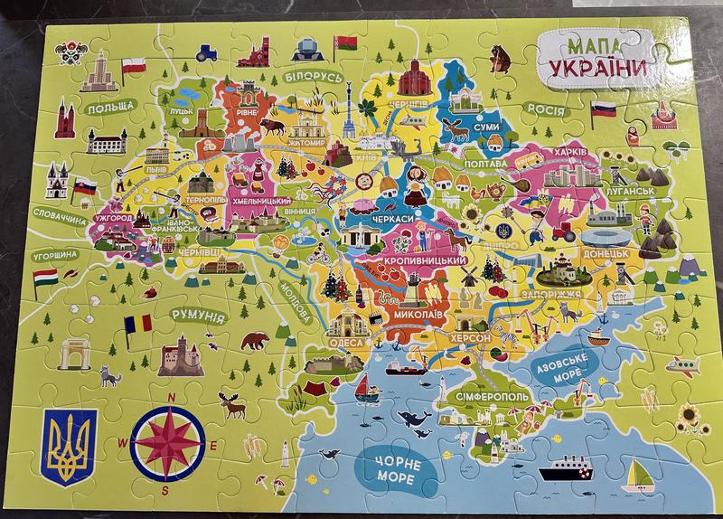 Пазли «Мапа України» Стан пазлів ідеальний, коробка трішки пошкоджена Вік: 5+ Кількість елементів: 100 дет. Розміри: пазла: 64х45 см; Матеріал: твердий картон. Мова: українська. Виробник: Dodo.