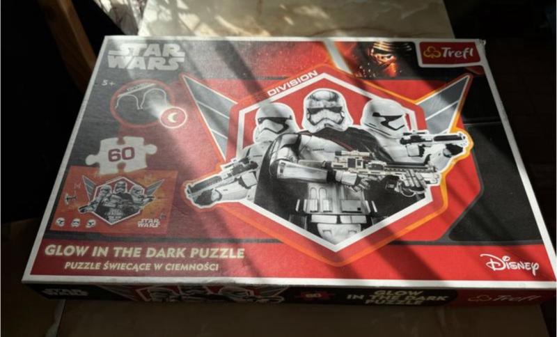 Пазли зібрані пару раз. Але коробка з одного боку надірвана, бо в магазині іншої не було, взяли таку. Стан відмінний. На обкладинці штурмовики. Виробник Польща. Написано, що світяться в темряві, я не перевіряла.