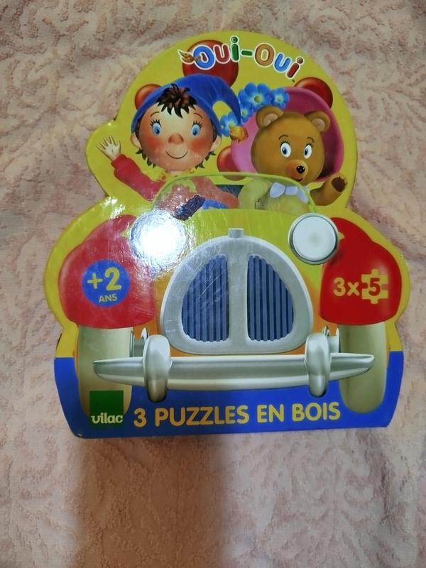 Коробка з трьома дерев'яними пазлами Oui Oui. Кожен пазл складається з 5 деталей. Підходить для дітей віком від 2 років. Стан гарний.