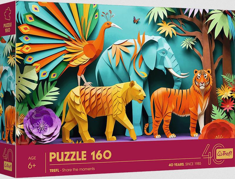 Пазл 160 деталей "Джунглі" Trefl. Після складання буде створена картинка розміром 275x410 mm. Висока якість, насиченість кольору і безпечне складання забезпечується каландровим світловідбиваючим папером, покритим екологічними харчовими фарбами.
