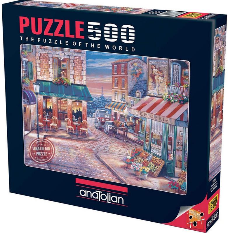 Пазл складається з 500 деталей, "Кафе Рандеву". Після складання буде створене зображення розміром 480x330 мм. Anatolian Puzzle -- це весела діяльність, якою можна займатися поодинці чи в групі. Це чудовий подарунок для будь-якого віку на дні народження, свята та особливі події. Завдяки картонній підставці, що входить до комплекту, ви можете розмістити кришку візуальної коробки вертикально/горизонтально Яскраві кольорові зображення, наклеєні на щільний спеціальний блакитний картон для пазлів, вирізані спеціальним інструментом для висікання ручної роботи. Завдяки високоякісним матеріалам і технологіям, які використовуються у виробництві продукції, вироби мають антивідблискову поверхню.