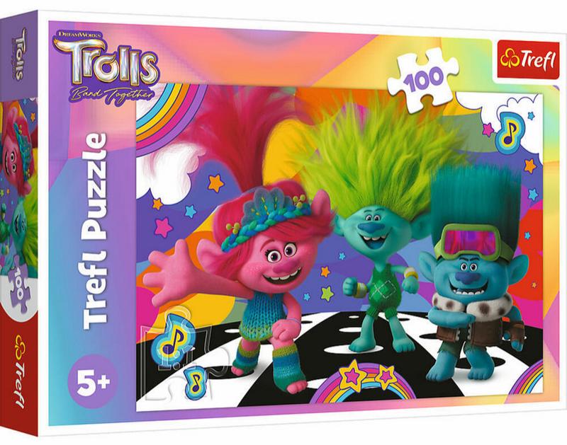 Пазл 100 деталей "Веселі тролі" Trefl. Після складання буде створена картинка розміром 410x275 mm. Висока якість, насиченість кольору і безпечне складання забезпечується каландровим світловідбиваючим папером, покритим екологічними харчовими фарбами.