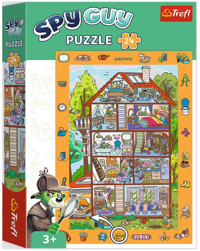 Spy Guy- це унікальна мультяшна головоломка, яка пробудить у вас спостережливість. Пазл 24 деталей "Шпигун - Вдома" Trefl. Після складання буде створена картинка розміром 410x275 mm. Висока якість, насиченість кольору і безпечне складання забезпечується каландровим світловідбиваючим папером, покритим екологічними харчовими фарбами.