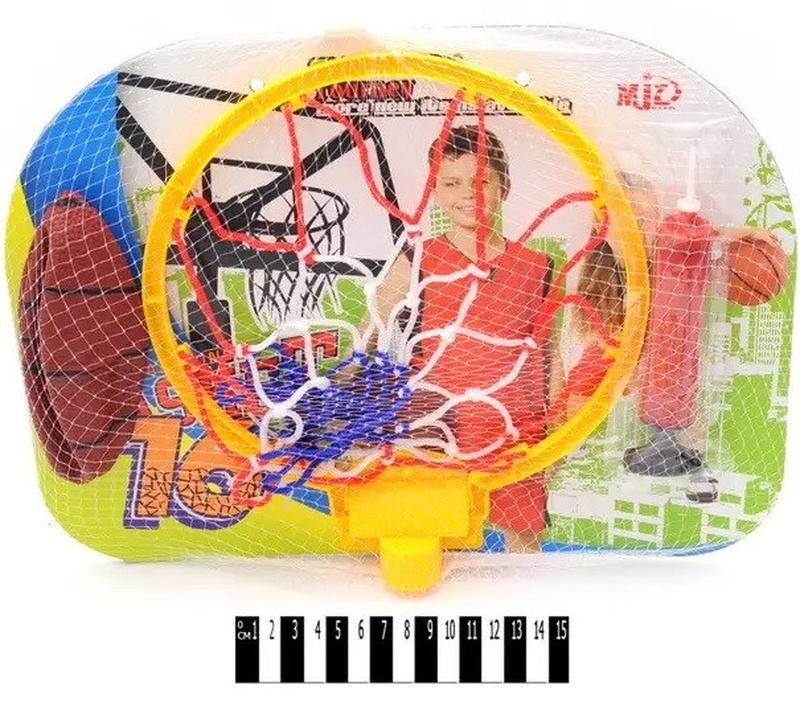 Дитяче баскетбольне кільце та щит виготовлені з пластмаси. У комплекті гумовий м'ячик, сітка, насос. Діаметр кільця — 21 см. Розмір щита 35 * 27 см. Паковання: сітка.
