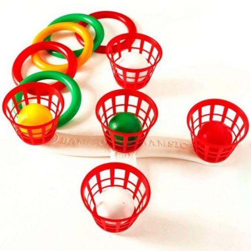 Кільцебурос. Мета гри: потрапити кульками в кошик, кільцями на стовпчики та набрати більше балів, ніж суперник. У комплекті: основа, 5 кульок, 5 стовпчиків, 5 кошиків і 5 кілець.