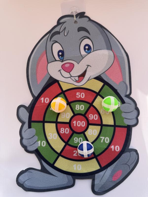 Гра Дартс Мішень виконана у вигляді круглого поля з різнокольоровими зонами, на яких нанесені цифри (від 10 до 100), що позначають кількість очок. Особливості гри: 1. Дизайн: Зайчик,Панда, Мавпеня тримає мішень, що робить гру веселою та привабливою для дітей. 2. М’які кульки: У комплекті є кульки з липучками (жовта, зелена та синя), які прилипають до мішені після кидка. 3. Безпечність: Завдяки липучкам гра безпечна, адже немає гострих дротиків, як у класичних дартсах. 4. Кріплення: У верхній частині мішені є гачок для підвішування. Правила гри: Гравці по черзі кидають кульки на мішень, намагаючись набрати якомога більше очок. Підрахунок ведеться на основі зон, куди потрапили кульки. Гра чудово підходить для розвитку координації рухів, точності та зорово-моторних навичок у дітей.