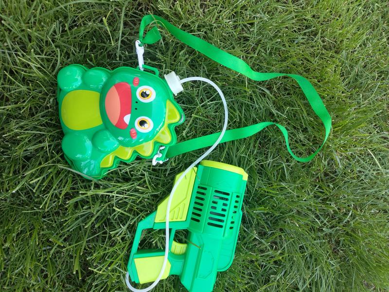 Пістолет-генератор мильних бульбашок з рюкзаком Дінозаврик. Стан хороший. Є дефекти,на фото показала,але вони ні на що не впливають. Працює від 4х батарейок АА. Батарейки в набір не входять.