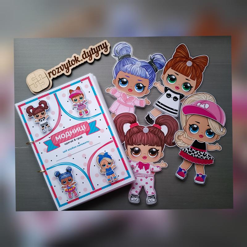 Альбом на липучках "Модницы LOL" У комплект входить: -12 страниц ( 6 двусторонних) а4 -4 больших куклы -4 маленьких куклы для одевания по образцу. -58 деталей. * Материал: двусторонняя фотобумага+ плотная ламинация Цена - 790 грн.
