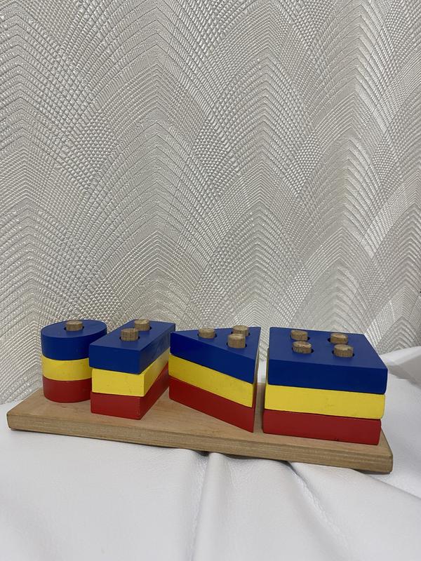 Кожна фігурка для свого місця, це розвиває мілку моторику в комплекті 4 різних фігури по 3 шт різних кольорів.Недолік: дощечка помальована трохи, але це не дуже видно. В інтернеті такі від 400 грн. Все зроблено з дерева