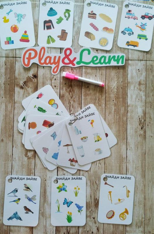 Багаторазова гра "Знайди та обведи зайве". В набір входить: 20 полів та водний маркер з губкою на ковпачку. Поля, скріплені кільцем, яке легко знімається.