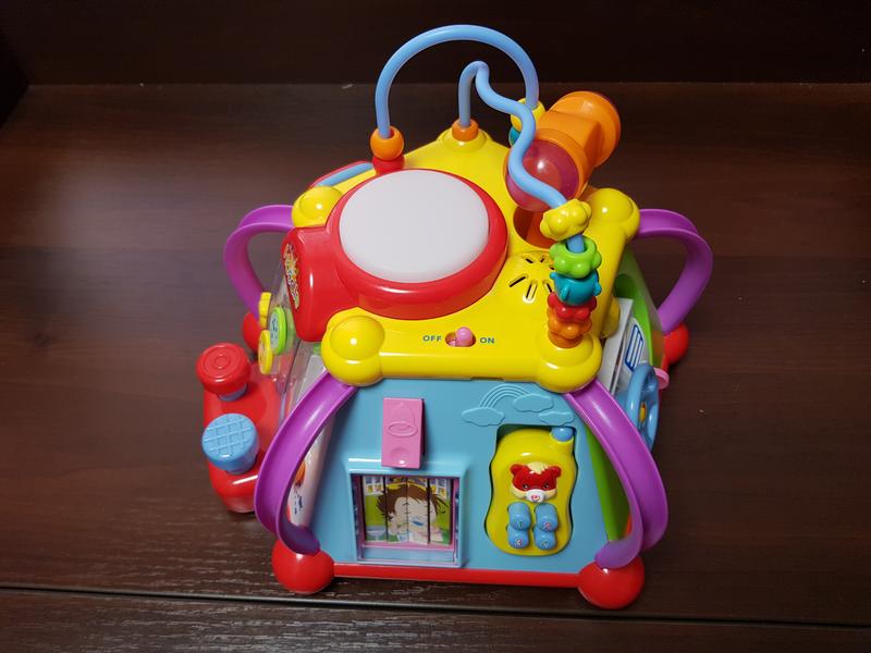 Развивающий игровой центр Мультибокс лабиринт, пирамида – это пятисторонняя усеченная пирамида, со звуковыми и световыми эффектами, которая включает в себя 15-ть веселых игр. Яркие цвета, забавные звуки, качественный материал – все это непременно придется по душе вашему ребенку. Такой мультибокс способствует развитию мелкой моторики, звукового и цветового восприятия, логического мышления и фантазии у ребенка. Характеристики: Рекомендованный возраст: с 18-ти мес; Материал: пластик. Питание: 3 батарейки типа АА (нет в комплекте;) Размеры: 30 х 30 х 23 см. Вес: 1.31 кг. На каждой грани пирамиды есть интересные и полезные игровые элементы: Панель машины, которая состоит из руля с сигналом, подвижной машинки, ключа зажигания и имеет звуковые эффекты (звук работы двигателя); Съемный телефон-пищалка имеет звуковые клавиши и окошко, в котором меняются картинки при нажатии на звонок (нюанс: запала картинка) ; Счеты-лабиринт и кнопка-барабан, которая мигает и издает веселые звуки; Интересная стучалка с молоточком и еще две на резинках; Два колесика, соединенные зубчатой передачей, при вращении которых раздается мелодия и светится большое колесико. Микрофон для караоке (усиливает звуки) и зеркальце, которое «превращается» в игрушечный телевизор поднятием выключателя снизу. Инструкция в наличии. Смотрите другие мои объявления.