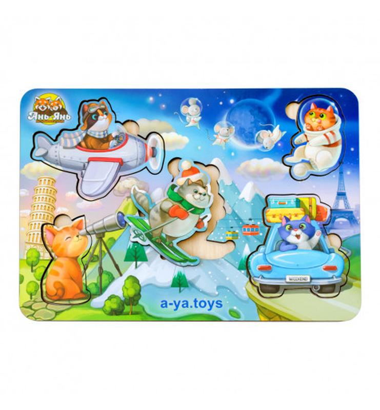 Деревянная игрушка рамка-вкладыш: котики - 4 (с космонавтом), ань-янь, псд143