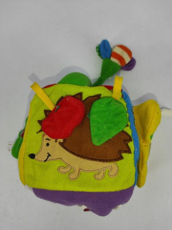 Дзвонить. На ежиком липучки. Есть шнуровка, там отпала одна заклепка. Цветок на шнурке. Червяк на резинке. Классная игрушка для развития моторики.