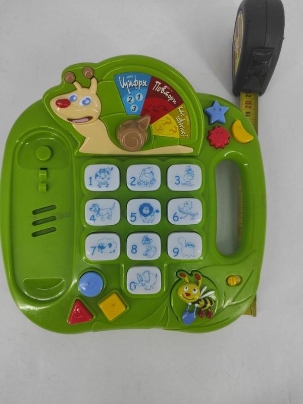 Загубилась трубка. Она была без функций. Телефон работает от батареек. Батарейки в комплект не входять. Звуки птиц и животных, цифры, упражнения на внимание. На русском языке.