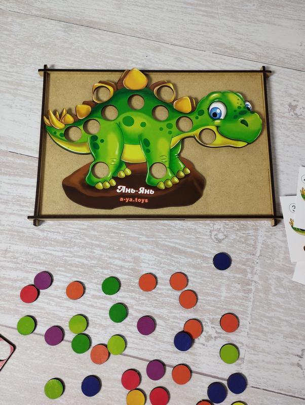 Развивающая игра мозаика. В наборе есть фигурка динозавра, у которого съемные детали в виде кружочков. Также есть карточки с заданиями, например, которых нужно правильно расставить цвета. Игра поможет развивать логику, усидчивость, цветовое восприятие. Материал дерево. Рекомендуемый возраст от 3 лет. Смотрите другие Мои объявления, подписывайтесь, имею регулярные обновления детской, женской одежды и обуви, и игрушек. Постоянным покупателям скидка 5%. При заказе от 500 грн бесплатно доставка вкрпоште.