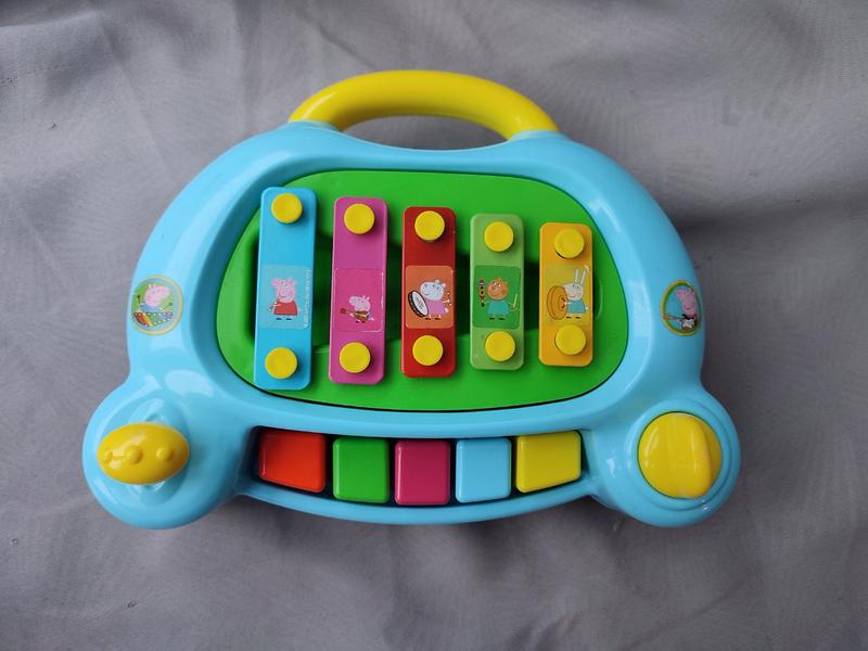 Оригінальна назва HTI Peppa Pig My 1ST Piano Оригінальна паличка загубилася, покладу в набір іншу від барабана. При натисканні на клавіші молоточок стукає по пластинам ксилофона знизу. Паличкою можна стукати по цим пластинам зверху. Жовті крутилки тріщать В ідеальному стані, тільки трошки фломастером діти прикрасили і на наклейках потертості. Все показала на фото