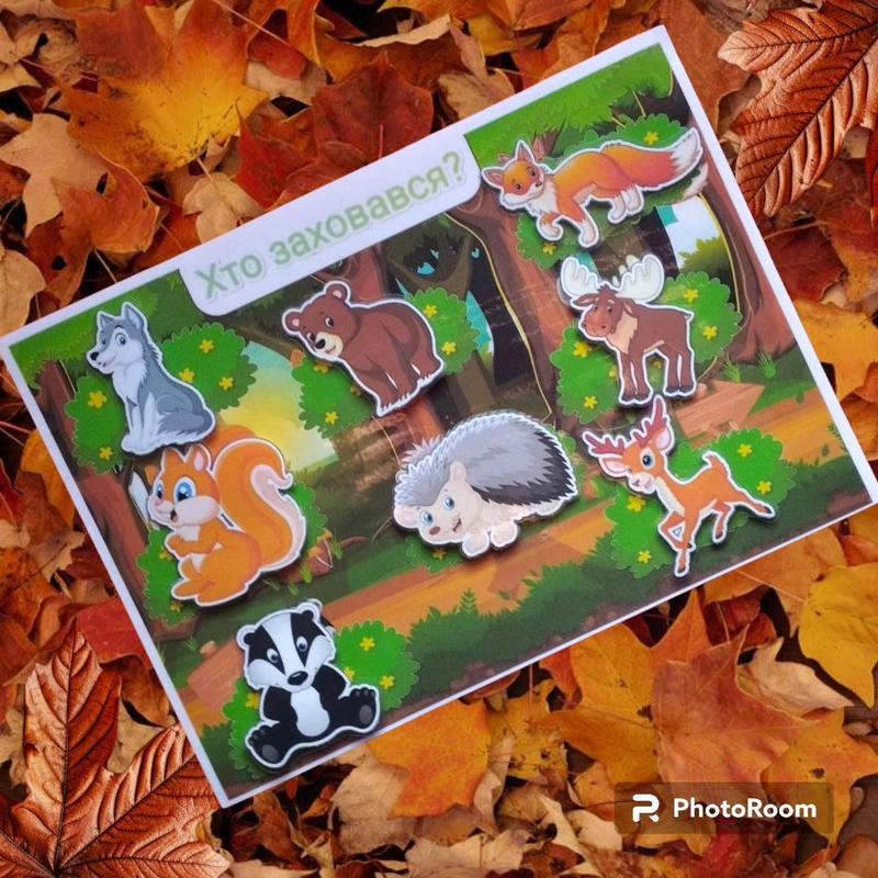 Ребенку нужно узнать кто спрятался и наклеить животное. Игра состоит из листа А4 и 8 деталей на липучках.
