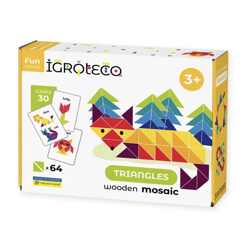 Оригінальна дерев'яна мозаїка складається з 64-х різнокольорових елементів трикутної форми, з яких можна викладати стилізовані зображення тварин, рослин, предметів побуту, цифри і букви, геометричні форми, орнаменти та безконечники. У наборі 10 двосторонніх кольорових карток з цікавими мозаїками, виклавши які, дитина зможе придумувати все нові й нові фігури. Дерев'яна розвиваюча іграшка ідеально доповнить навчання та розвиток дитини вдома, в приватних та державних дитячих садочках, інклюзивних центрах. Іграшка розвиває: - розуміння кольору і форми - дрібну моторику, контроль над пальцями рук - абстрактне мислення - вміння шукати нестандартні рішення - фантазію, уяву - тренує точність рухів Мозаїка виготовлена з цільної деревини товщиною 5 мм, та пофарбована сертифікованими фарбами на водній основі.